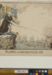 Dorothy Jordan, clad in a masculine riding dress has an open playbook in hand, “Act III. Enter Little Pickle." The Duke of Clarence, slightly ahead and in front of her, pulls the miniature royal... Delineator: Gillray, James 23 April 1797 |