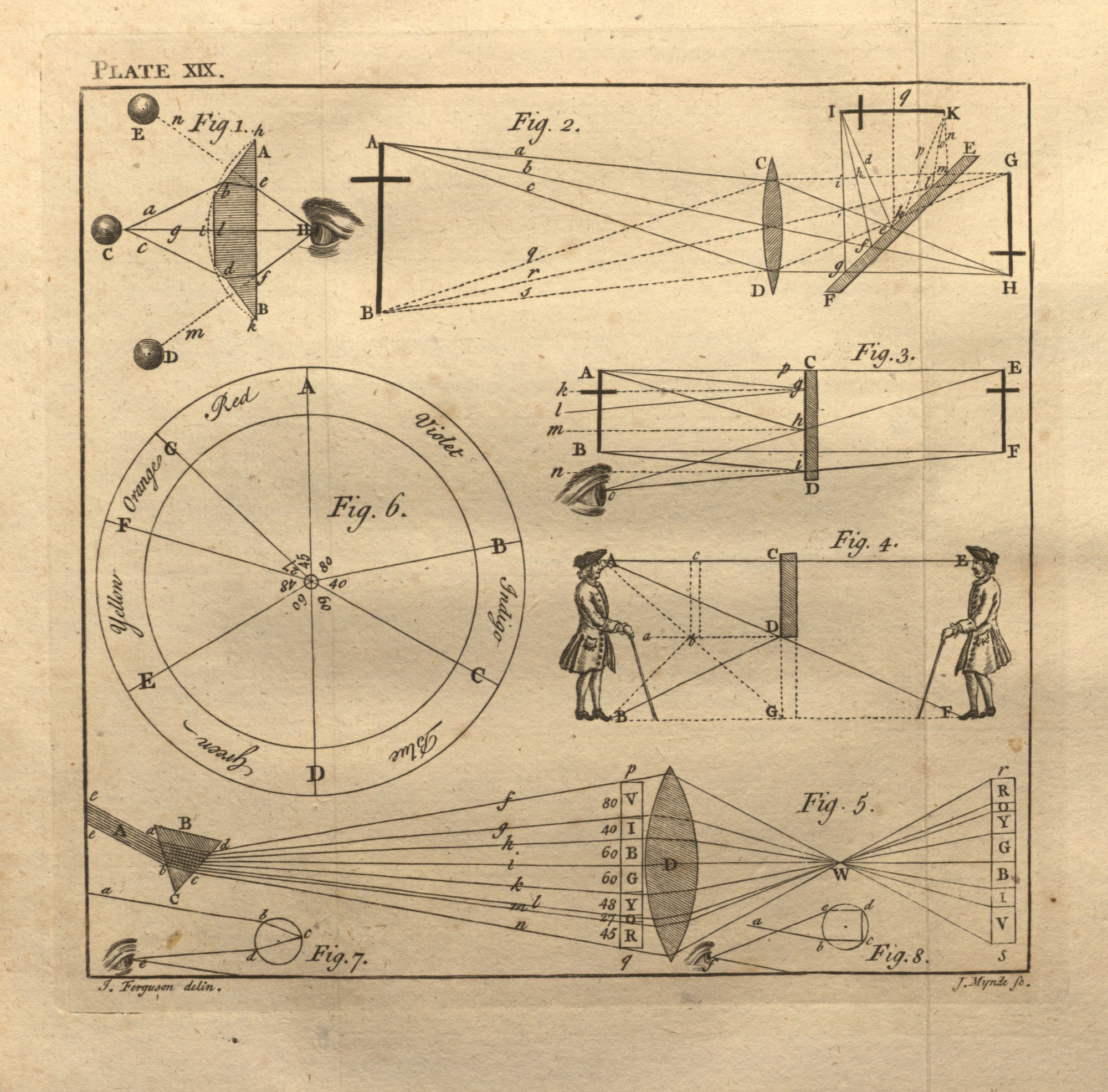 “Plate XIX” features eight figures to accompany the text entitled “Of Optics.” Figure 1 illustrates the manner in which light travels through a multiplying glass to the eye. Figure 2 diagrams the optical physics of the portable box camera obscura with a mirror to right the inverted image. Figure 3 illustrates the physics of the common looking glass. Figure 4 explains the optical illusion of reduced proportion in a looking glass. Figure 5 illustrates the separation of light into the color spectrum through a glass prism. Figure 6 is a diagram of the color spectrum of light on a wheel. Figures 7 and 8 are small geometric diagrams mapping the movement of light rays in the illusion of an arched rainbow.